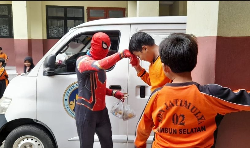 Sopir Satuan Pemenuhan Pelayanan Pemenuhan Gizi (SPPG) Arrahman Sulaiman, berkostum spiderman mengantarkan makan bergizi gratis (MBG) ke SDN 02 Jatimulya, Tambun Selatan, Bekasi pada Senin (19/1/2026). (Istimewa).