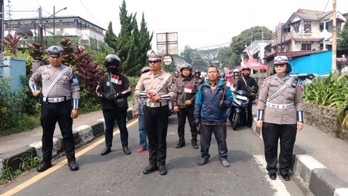 Petugas Satlantas Polres Bogor juga terlibat berjejer sembari mengibarkan bendera merah putih di hadapan para pengendara.
