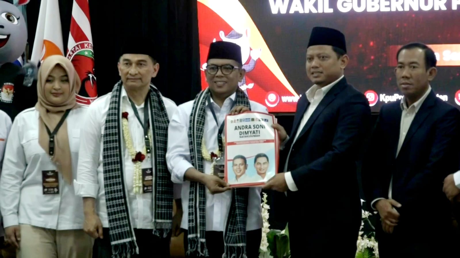 Serang, tvrijakartanews - Bakal pasangan calon gubernur dan wakil gubernur Banten, Andra Soni dan Dimyati menyerahkan dokumen sebagai syarat maju di perhelatan pesta demokrasi tahun 2024.