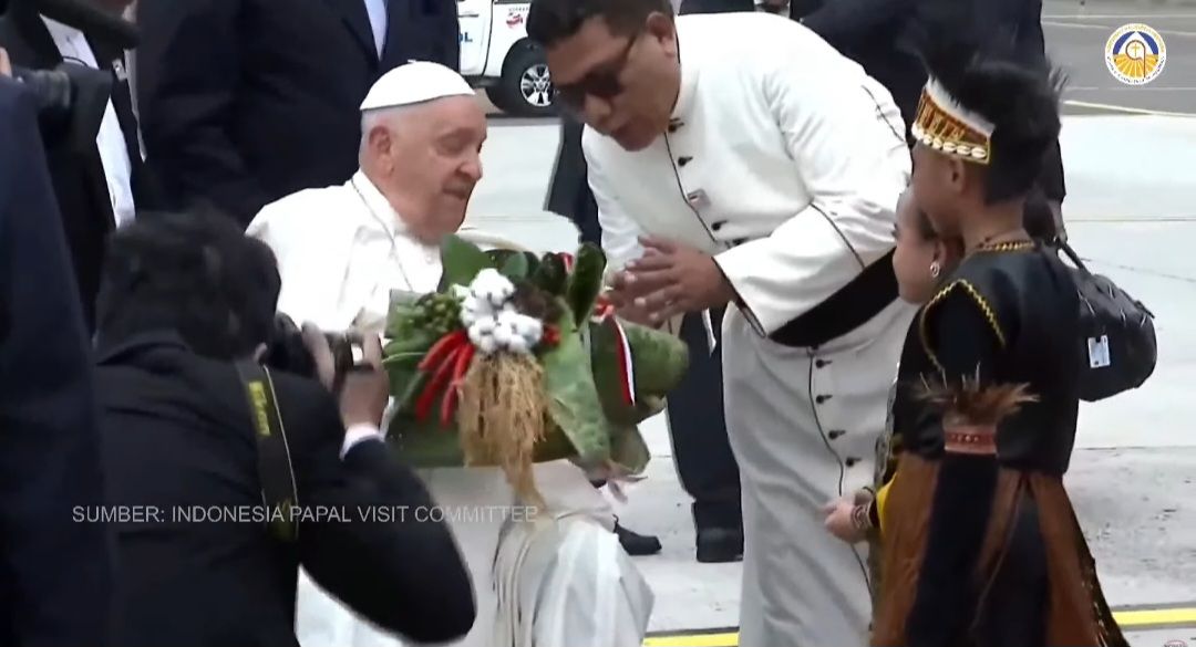 Pemimpin Gereja Katolik Dunia Paus Fransiskus dan rombongannya mendarat menggunakan pesawat komersil di Bandara Soekarno-Hatta, Jakarta, Selasa (3/9/2024). Paus kemudian disambut dua anak-anak dan diberikan buket bunga bermakna Bhinneka Tunggal Ika. (Foto: tangkapan layar YouTube Komsos Katedral Jakarta).