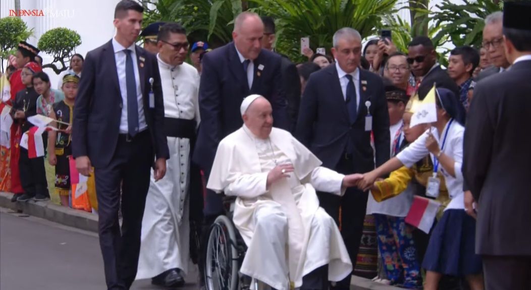 Paus Fransiskus disambut antusias anak-anak di Istana Merdeka, Jakarta Pusat, Rabu (4/9/2024). (Foto: tangkapan layar YouTube Sekretariat Presiden).