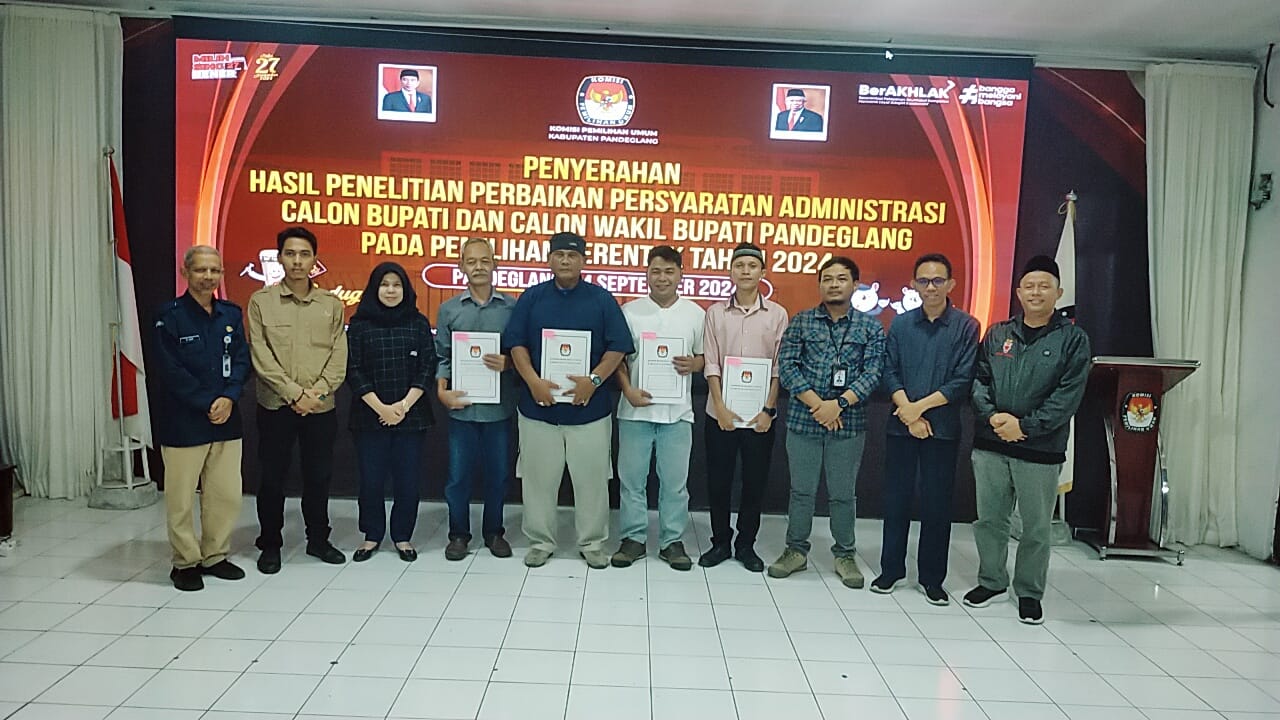 "Uday Suhada - Pujiyanto dari jalur perseorangan, Fitron Nur Ikhsan - Diana Drimawati Jayabaya, Raden Dewi Setiani - Iing Andri Supriadi dari jalur partai politik, dan Aap Aptadi - Ratu Anita dari jalur perseorangan,"kata Ketua KPU Pandeglang Nunung Nurazizah, Minggu (22/09/2024).
