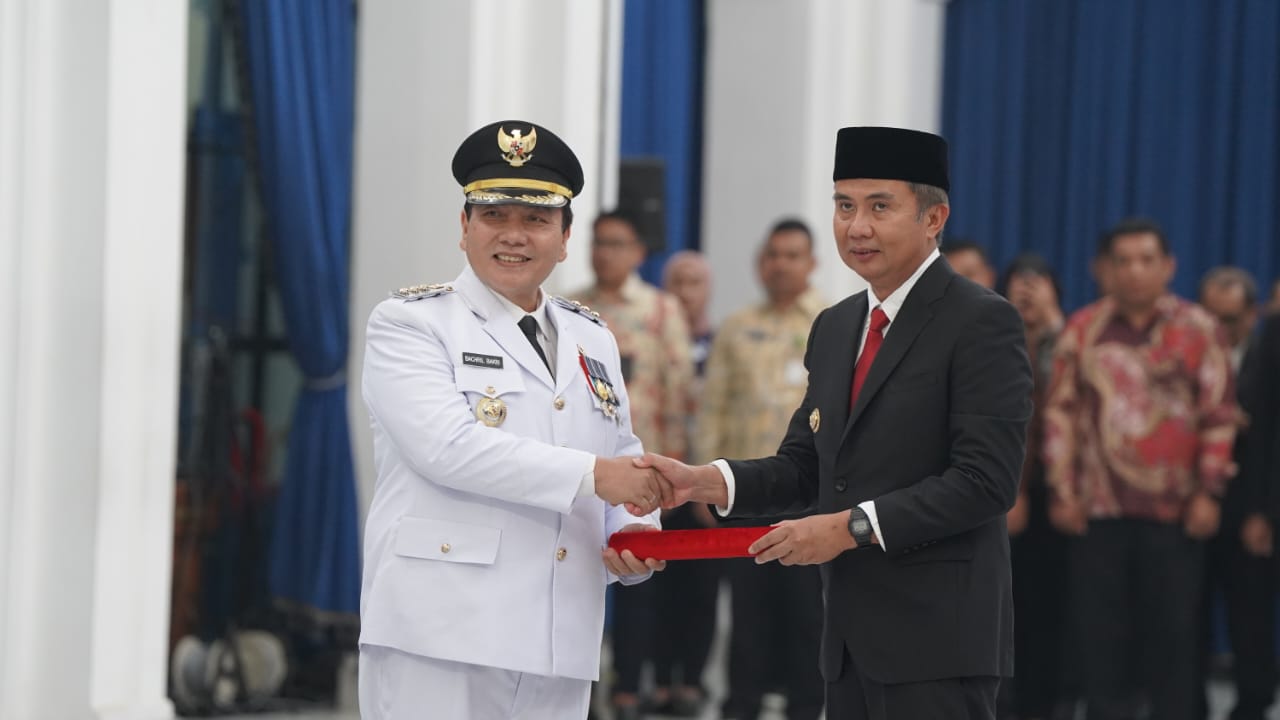 Pj Bupati Bogor, Bachril Bakri (kiri) saat dilantik oleh Pj Gubernur Jawa Barat, Bey Machmudin (kanan), pada Kamis 26 September 2024 / Foto: Istimewa