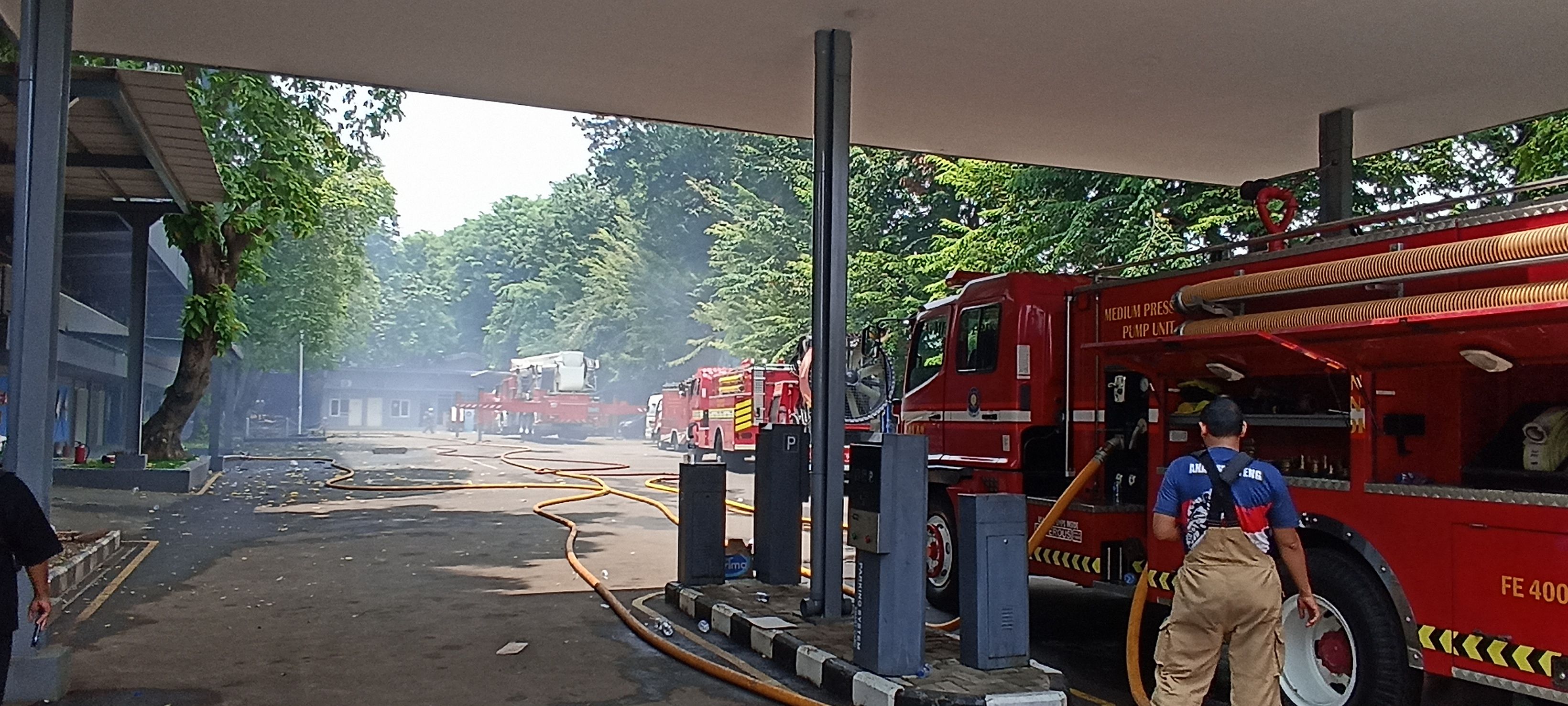 Saat ini nampak petugas pemadam kebakaran tengah melakukan pendinginan pasca kebakaran yang melanda Gedung Bakamla.