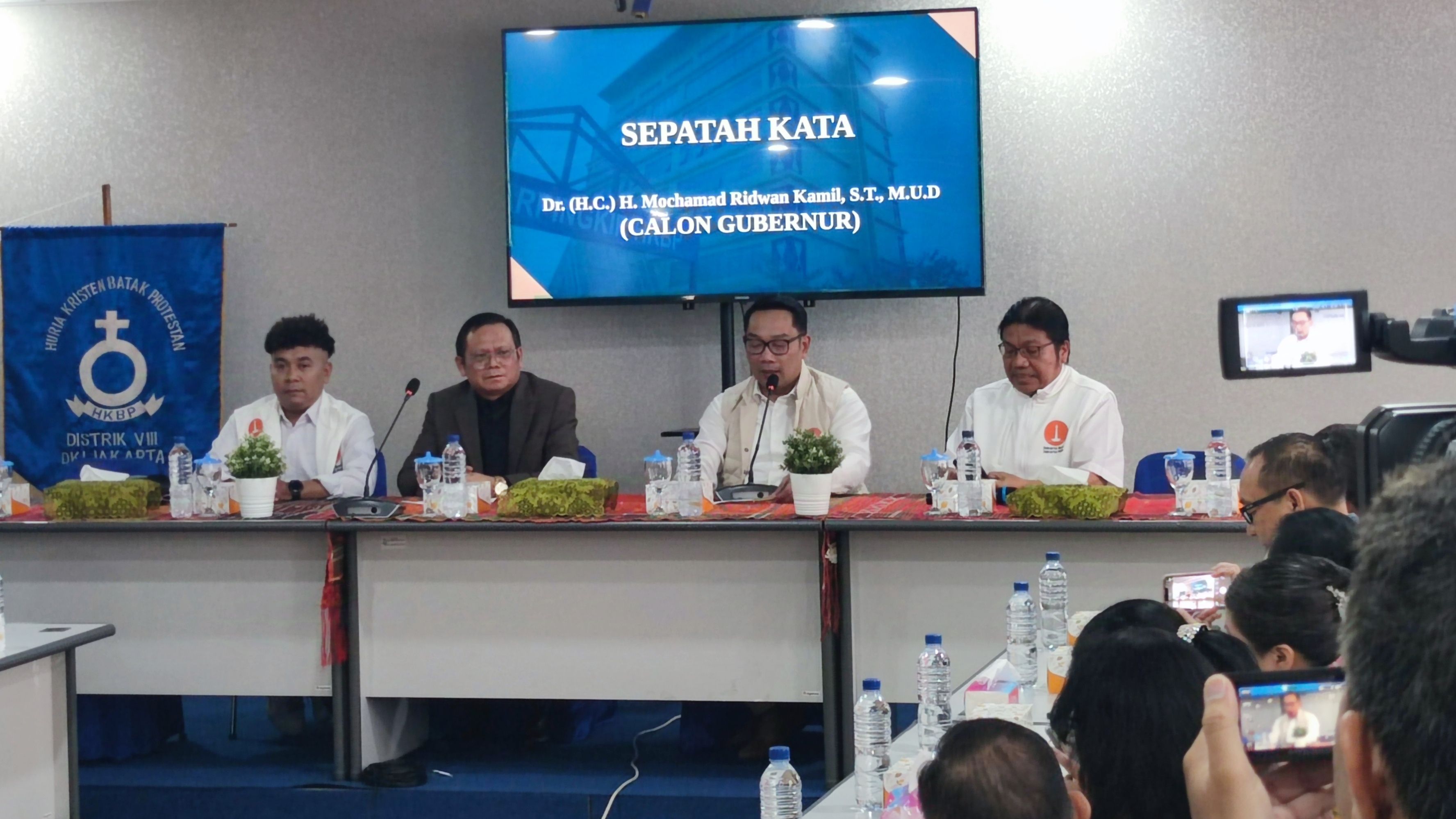 Calon Gubernur Jakarta Nomor Urut 1, Ridwan Kamil alias RK saat bertemu jemaat HKBP Sopo Marpingkir. Foto M Julnis Firmansyah
