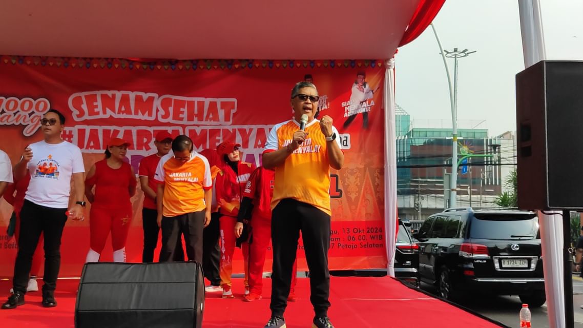 Sekretaris Jenderal PDIP Hasto Kristiyanto saat dampingi calon gubernur Jakarta Pramono Anung dalam agenda Senam Massal Jakarta Menyala di Gambir, Jakarta Pusat, Minggu (13/10/2024). (Foto: Chaerul Halim).