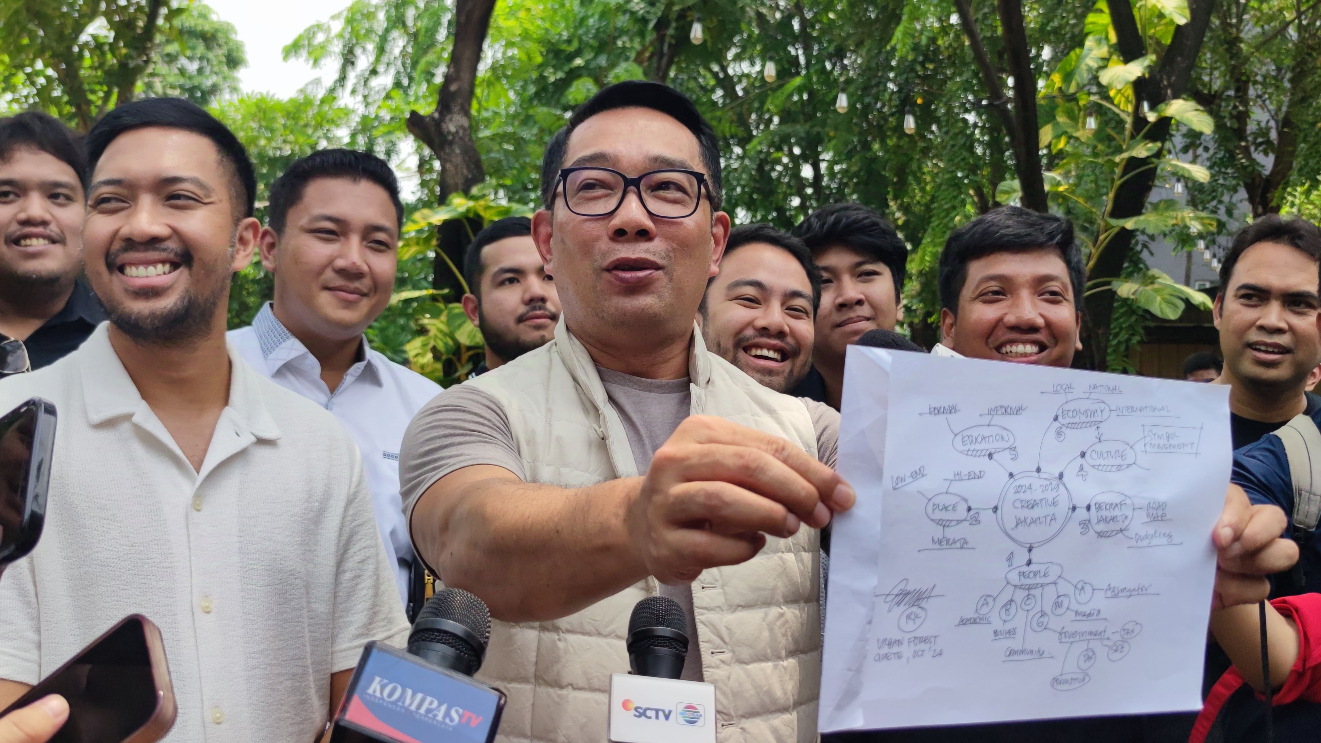 Terakhir, Ridwan Kamil menegaskan komitmennya untuk menjadikan Jakarta sebagai kota ekonomi kreatif global jika terpilih. Saat berdiskusi dengan para pelaku ekonomi kreatif di Urban Forest, Cipete, Jakarta Selatan, Ridwan Kamil memaparkan enam langkah strategis yang disusunnya sendiri.