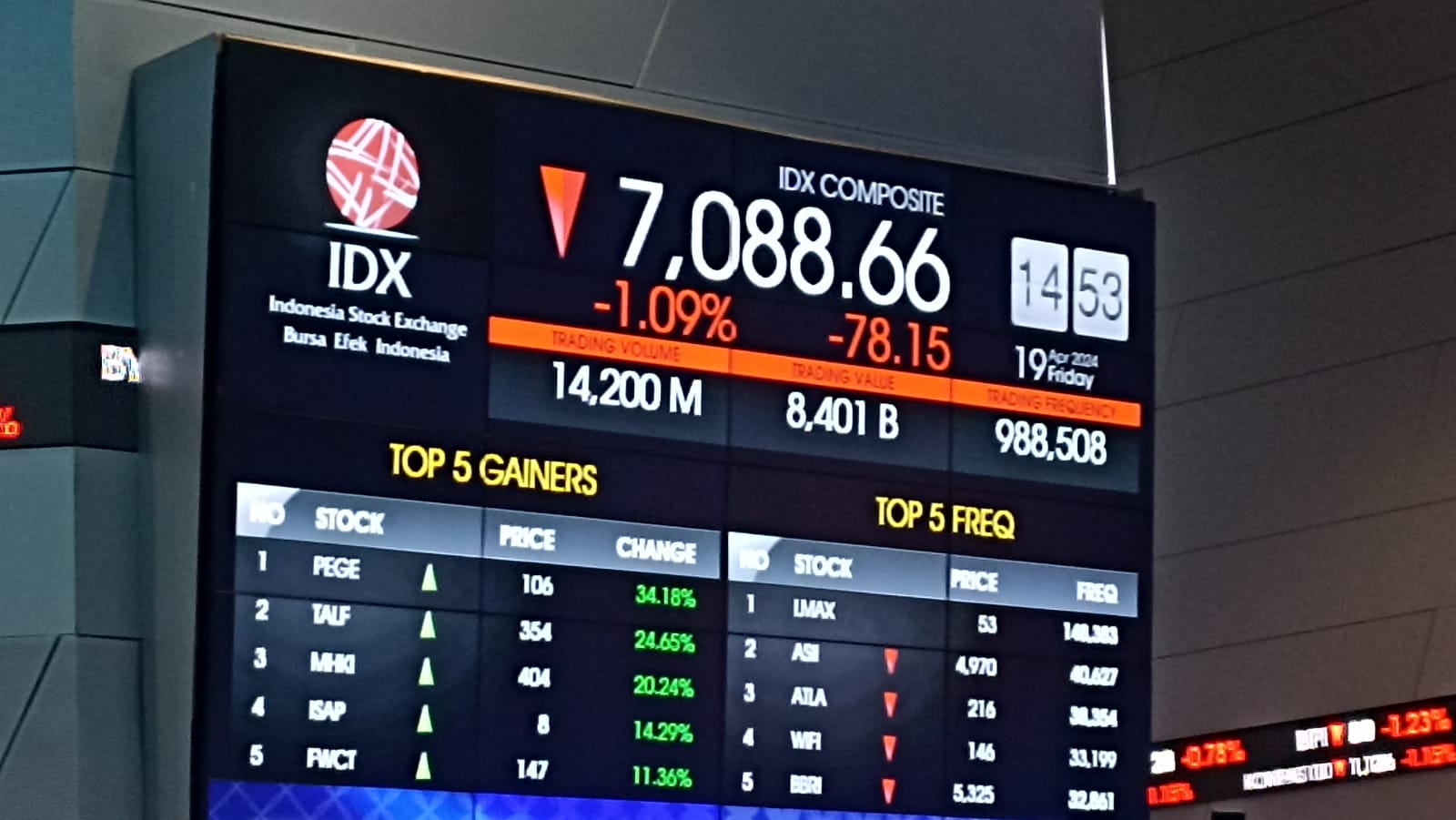 Frekuensi perdagangan saham tercatat sebanyak 1.185.044 kali transaksi dengan jumlah saham yang diperdagangkan sebanyak 19,96 miliar lembar saham senilai Rp10,86 triliun. Sebanyak 189 saham naik 423 saham menurun, dan 175 tidak bergerak nilainya.