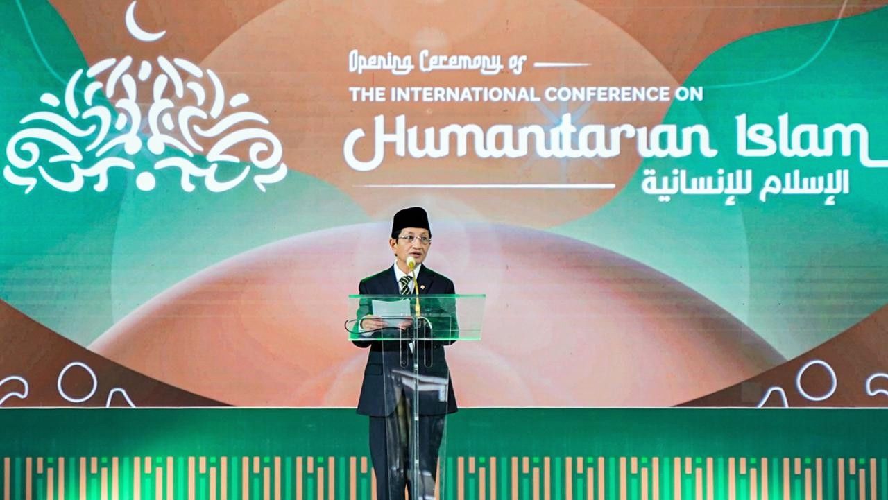 Menteri Agama (Menang), Nasaruddin Umar saat membacakan pesan Presiden RI dalam acara Konferensi Internasional Humanitarian Islam 2024 di Kampus Universitas Indonesia. Foto : Kementerian Agama RI