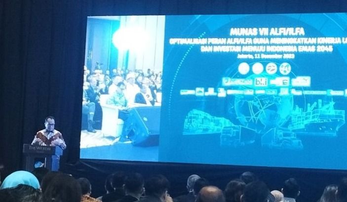 Menhub Budi Karya Sumadi saat memberikan sambutan kunci dalam pembukaan Munas ke-7 DPP Asosiasi Logistik dan Forwader Indonesia/Indonesia Logistics & Forwaders Association (ALFI/ILFA) Tahun 2023.
