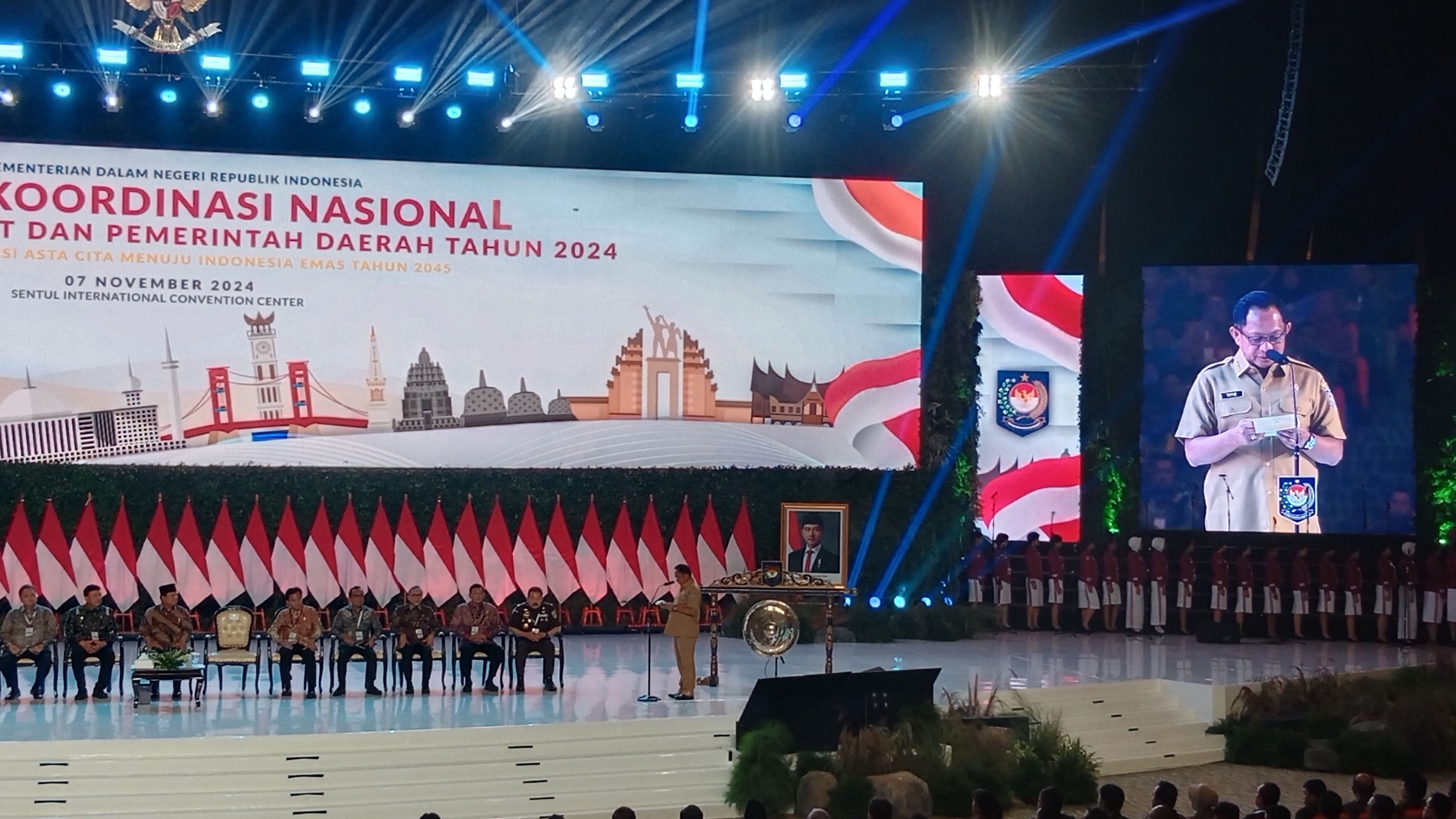 Menteri Dalam Negeri (Mendagri) Tito Karnavian saat menyampaikan laporan kegiatan Rakornas Pemerintahan dj SICC, Kabupaten Bogor, Jawa Barat, pada Kamis 07 November 2024 / Foto: Dimas Yuga Pratama