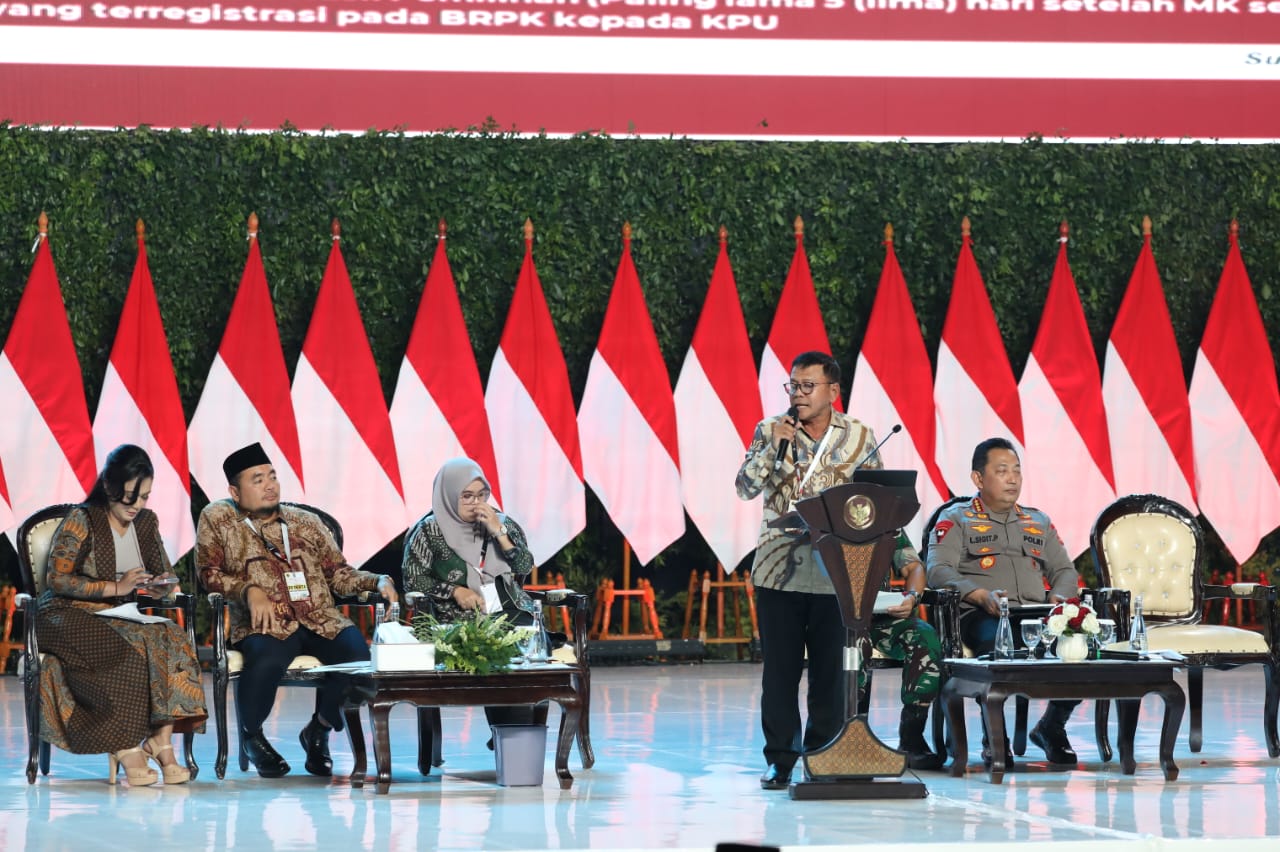 Hal ini disampaikan saat Panel keempat dengan tema “Stabilitas Politik, Hukum, dan Keamanan untuk Pilkada Serentak yang Aman dan Damai” pada acara Rapat Koordinasi Nasional (Rakornas) Pemerintah Pusat dan Pemerintah Daerah (Pemda) Tahun 2024 di Sentul International Convention Center (SICC), Kabupaten Bogor, Jawa Barat, Kamis 07 November 2024.