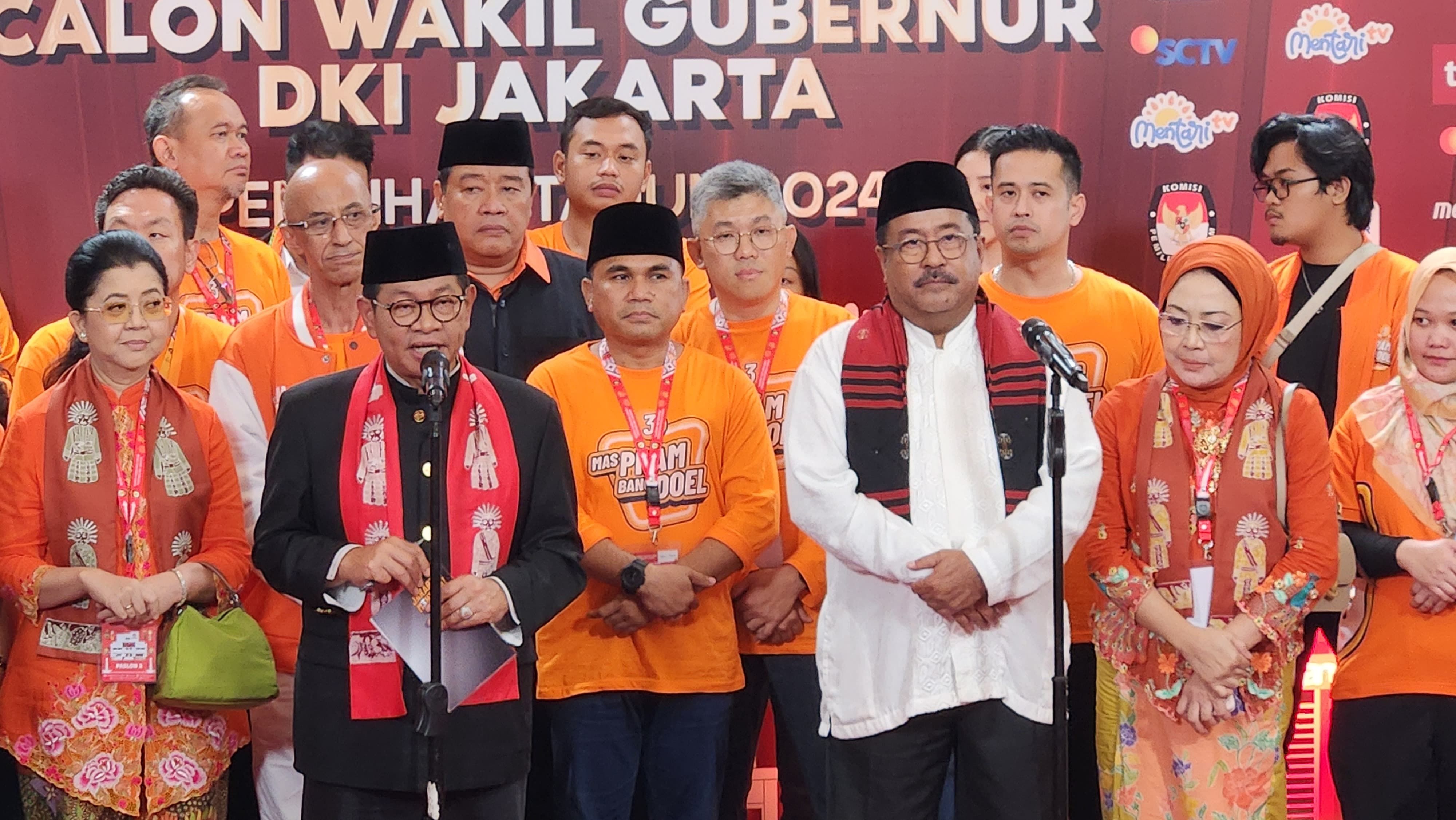 Calon gubernur dan wakil gubernur Jakarta nomor urut 3, Pramono Anung-Rano Karno usai debat pamungkas Pilkada Jakarta di Hotel Sultan, Jakarta Pusat, Minggu (17/11/2024). (Foto: Chaerul Halim).