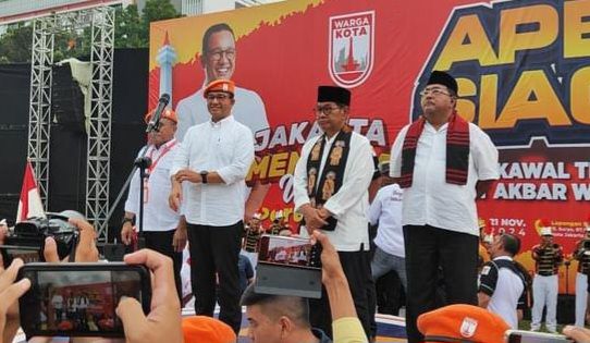 Pasangan Pramono Anung-Rano Karno bersama Anies Baswedan menghadiri acara Apel Siaga dan Kawal TPS dan Rapat Akbar Warga Kota di Lapangan Blok S, Jakarta Selatan, Kamis (21/11/2024). (Foto: Chaerul Halim).