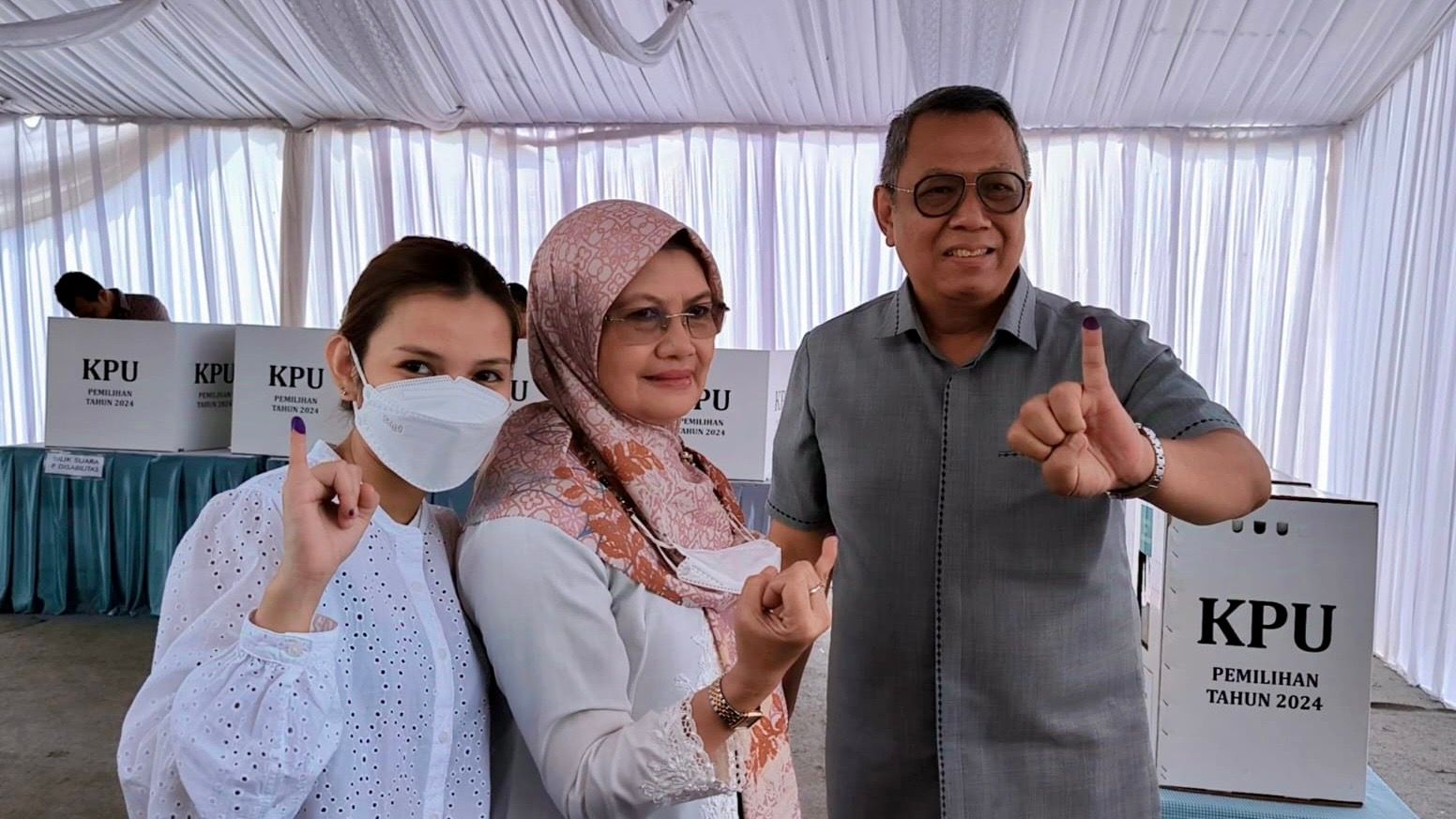 Calon Wali Kota Nomor Urut Satu Benyamin Davnie Bersama Istri dan Anaknya Menyalurkan Hak Pilihnya di TPS 13 Lengkong Karya Serpong Utara.