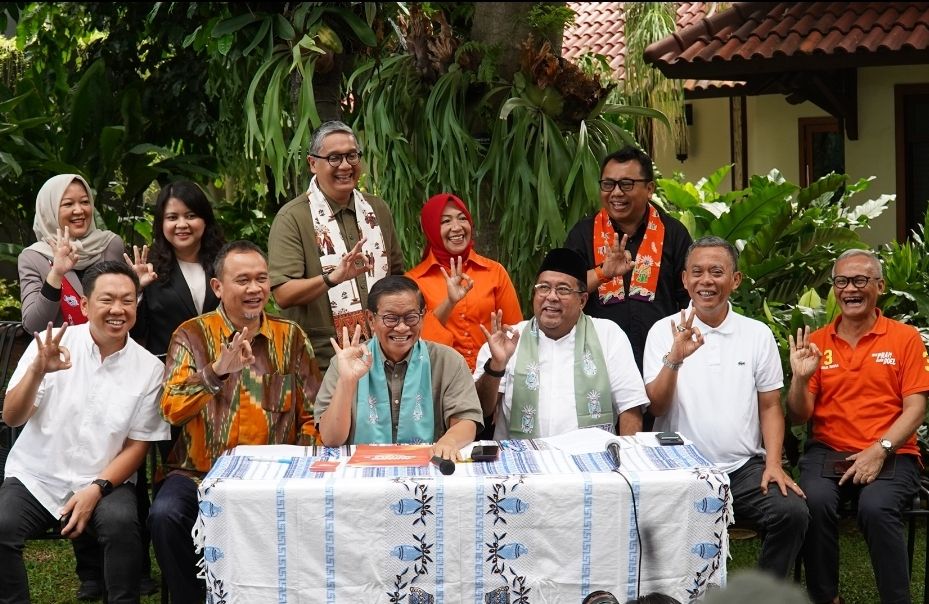 Calon gubernur dan wakil gubernur Jakarta nomor urut 3, Pramono Anung-Rano Karno didampingi tim pemenangannya usai menggelar konferensi pers terkait hasil real count Pilkada Jakarta 2024. Konferensi pers ini digelar di kediaman Pramono, Jalan H. Ambas, Cipete, Jakarta Selatan, Kamis (28/11/2024). (Foto: istimewa).