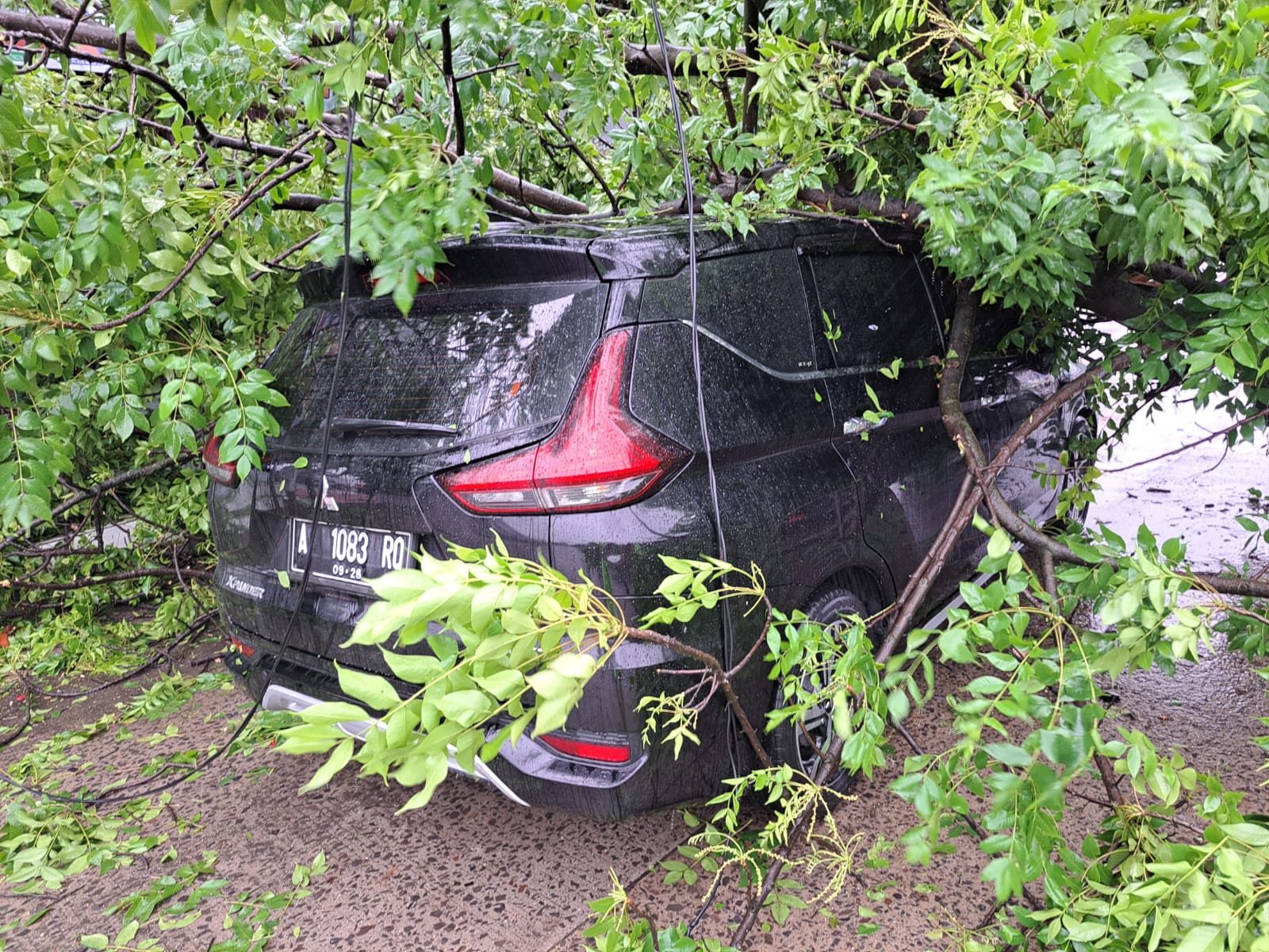 Untuk di Jl. Bojonegara-Serdang, ada dua mobil yang tertimpa pohon tumbang. Hal itu terjadi akibat hujan dan angin kencang.