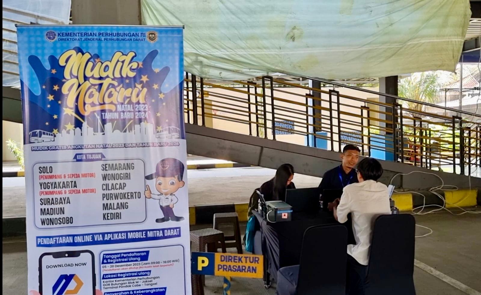 Tangsel, tvrijakartanews - Kementerian Perhubungan (Kemenhub) membuka posko pelayanan mudik gratis di Terminal Tipe A Pondok Cabe, Pamulang kota Tangerang Selatan (Tangsel), untuk mengakomodir para pemudik khusus pemotor dalam perayaan natal 2023 dan tahun baru (Nataru) 2024.