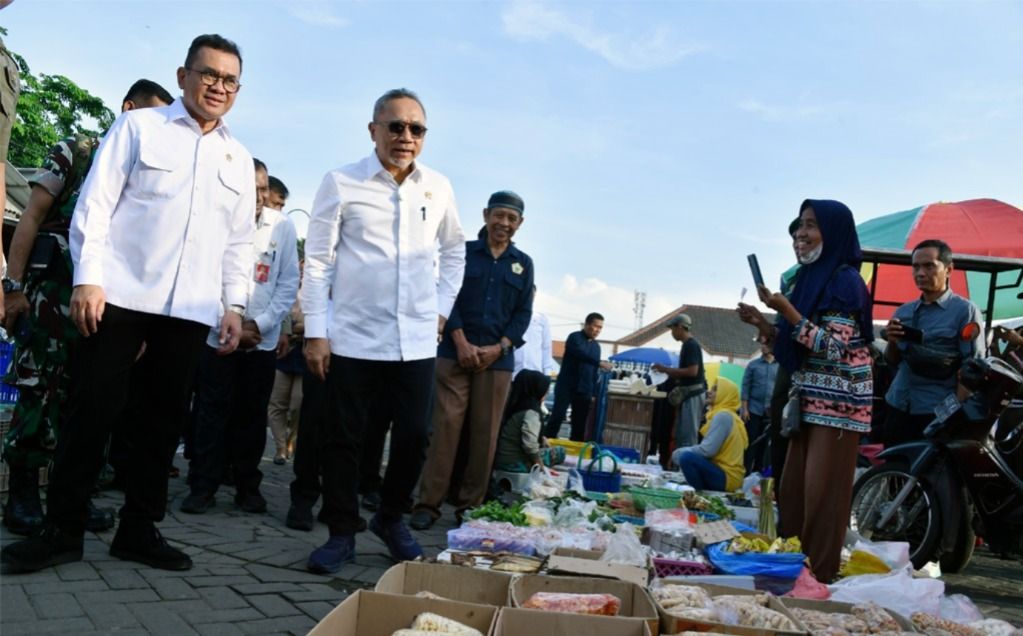Menteri Perdagangan Budi Santoso (kiri) dan Menko Bidang Pangan Zulkifli Hasan (Kanan) meninjau harga kebutuhan pokok di Pasar Wisata Pabean Sedati di Sidoarjo. (Humas Kemendag)