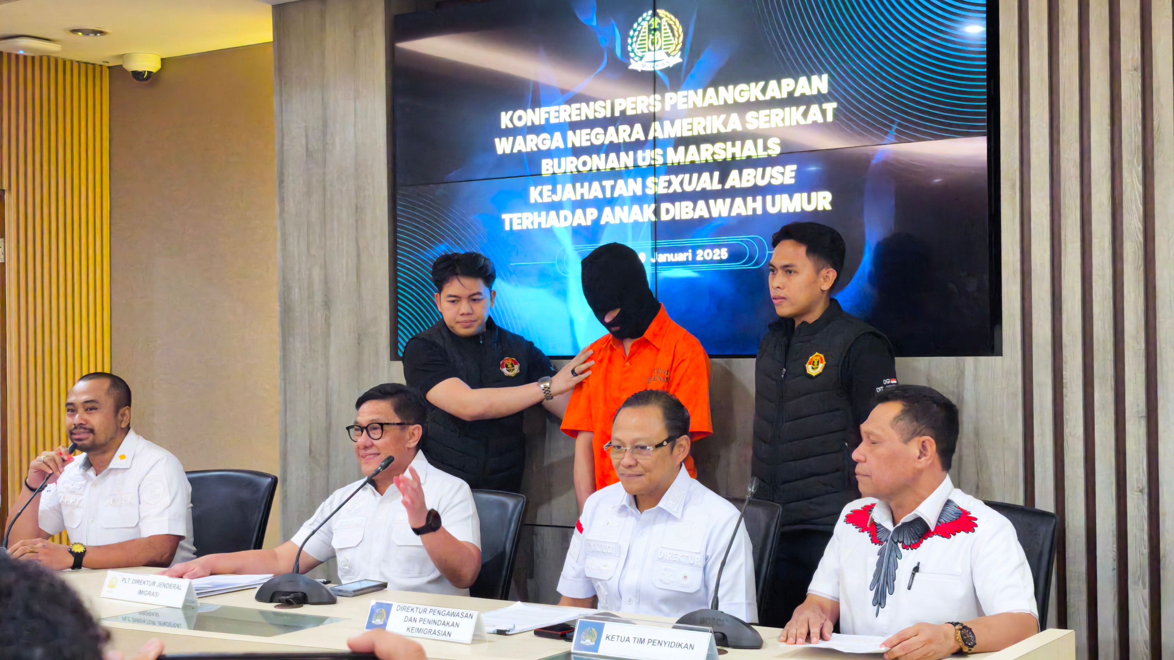 Ditjen Imigrasi saat merilis penangkapan warga Amerika Serikat berinisial TJC yang menjadi buronan U.S. Marshals. Foto M Julnis Firmansyah