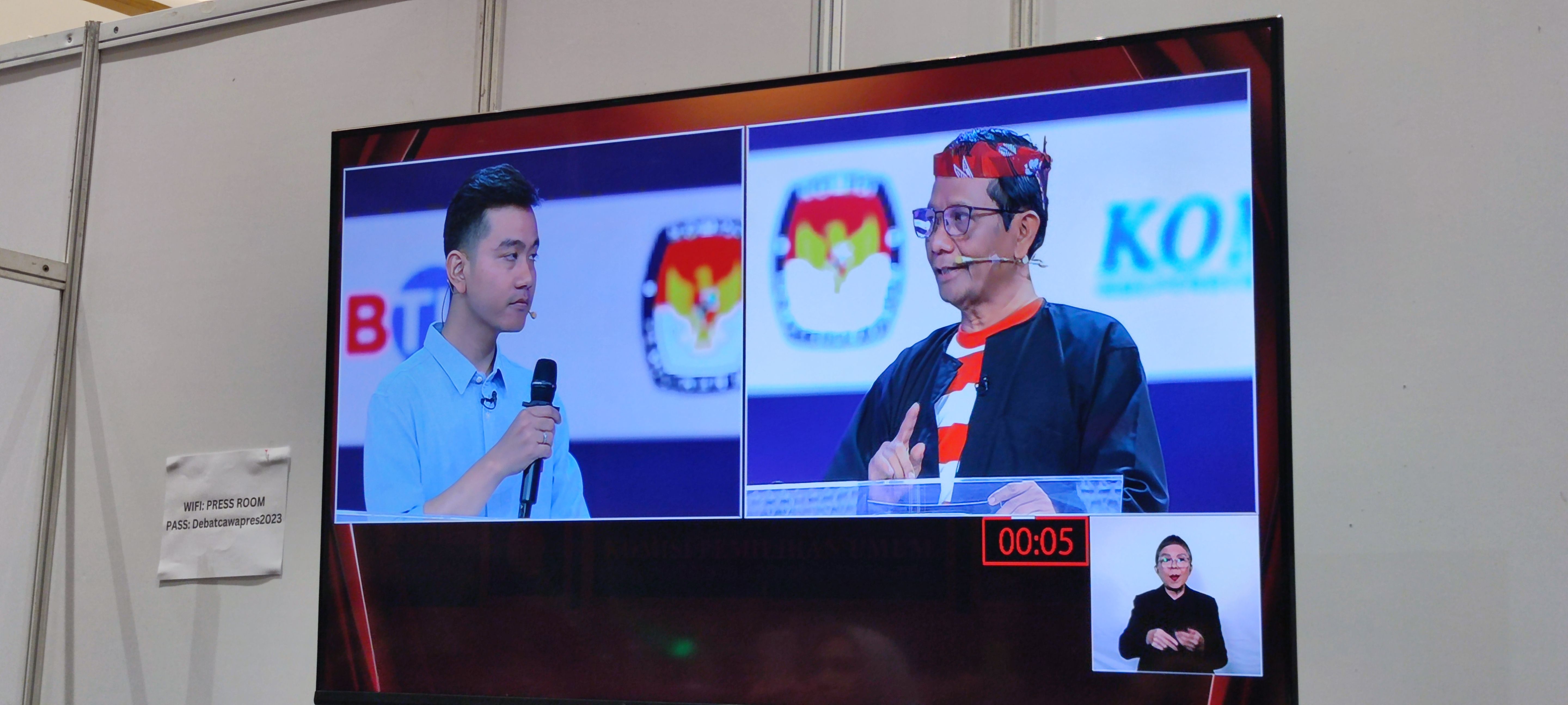 Suasana debat antara Mahfud MD dan Gibran Rakabuming Raka di JCC, Jakarta Pusat. Foto: M Julnis Firmansyah