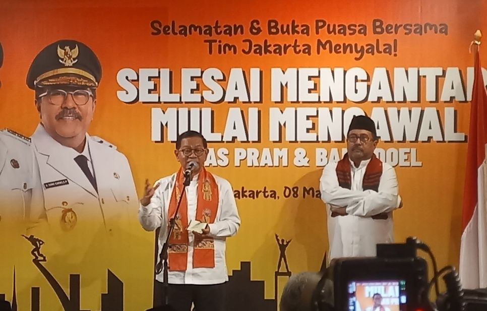 Gubernur Jakarta Pramono Anung dan Wakil Gubernur Jakarta Rano Karno dalam acara pembubaran tim sukses Pramono-Rano di Cemara 19, Cikini, Jakarta Pusat, Sabtu (8/3/2025). (Foto: Chaerul Halim).