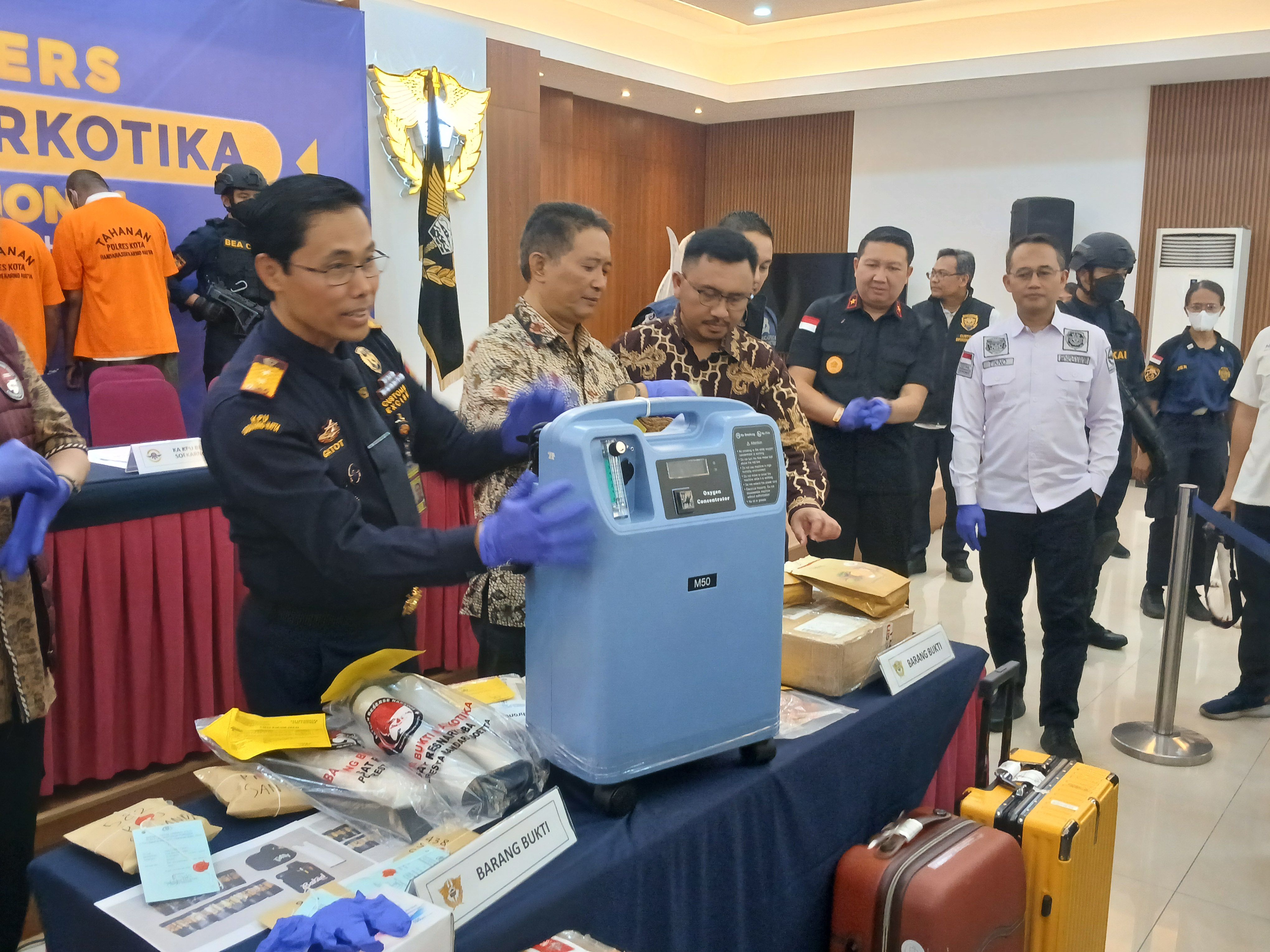 Berdasarkan hasil pemeriksaan, paket tersebut berisi oksigen konsentrator yang ditemukan anomali terhadap kompartemennya sehingga dilakukan pembongkaran. Setelah dibongkar, ditemukan 2 (dua) tabung yang berisi kristal bening dengan berat kotor kurang lebih 505 gram yang diduga merupakan narkotika.
