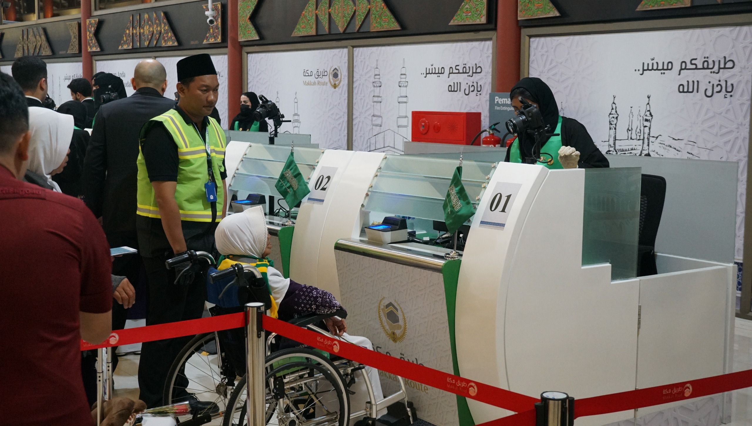 Foto : Dokumentasi Istimewa/ Proses pemeriksaan dokumen keimigrasian jemaah calon haji di Bandara Soekarno Hatta menggunakan fasilitas Makka Route.