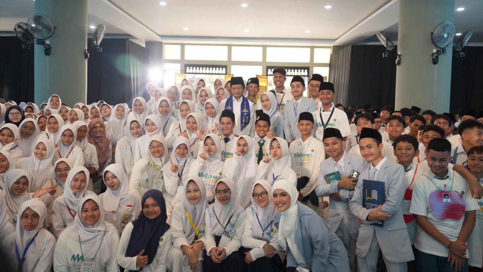 Menteri Agama (Menag) Nasaruddin Umar berfoto dengan siswa-siswi, saat hadir dalam agenda pembukaan kegiatan Masa Taaruf Siswa Madrasah (Matsama) 2025 yang dipusatkan di Madrasah Aliyah Negeri (MAN) 4 Jakarta, Senin (14/7/2025). Foto : Istimewa/ Kemenag RI