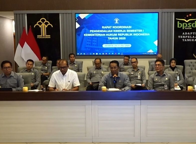 Menteri Hukum Supratman Andi Agtas bersama jajarannya saat konferensi pers di Auditorium BPSDM Kementerian Hukum, Cinere, Depok pada Selasa (29/7/2025).