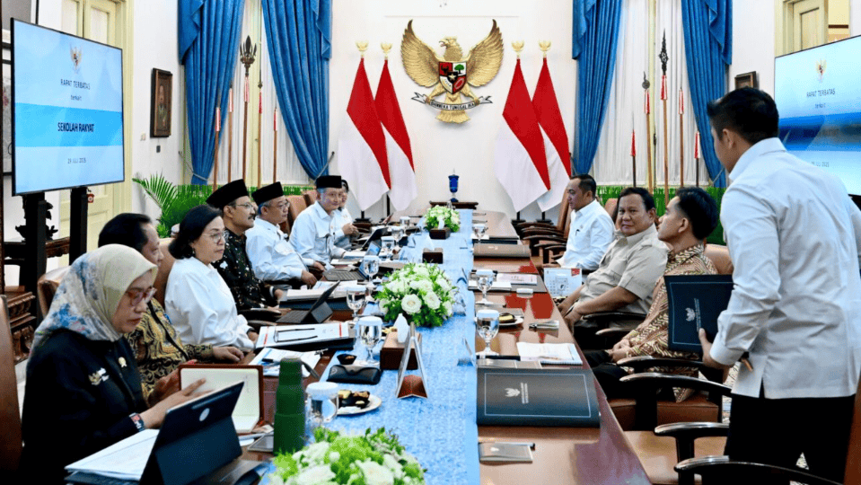 Presiden Prabowo Subianto memimpin rapat terbatas dengan Wakil Presiden Gibran Rakabuming dan sejumlah Menteri Kabinet Merah Putih di Istana Merdeka, Jakarta, membahas penyelenggaraan Sekolah Rakyat Rintisan Tahun 2025–2026. Foto Sekretariat Presiden