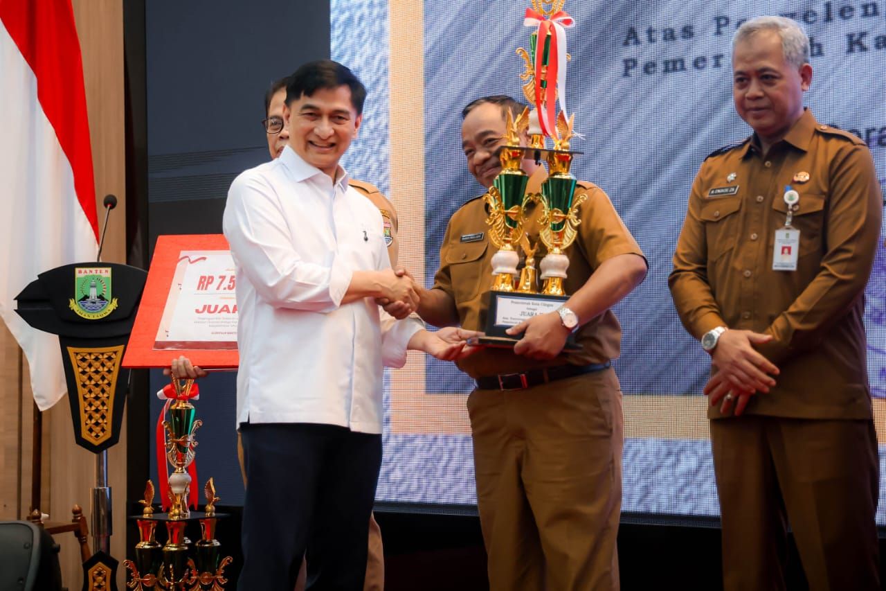 Wagub Banten, Dimyati Natakusumah Saat Menyerahkan Penghargaan Hasil Pengawasan Kearsipan Eksternal LKD Kabupaten/Kota dan Hasil Pengawasan Kearsipan Internal Perangkat Daerah Provinsi Banten