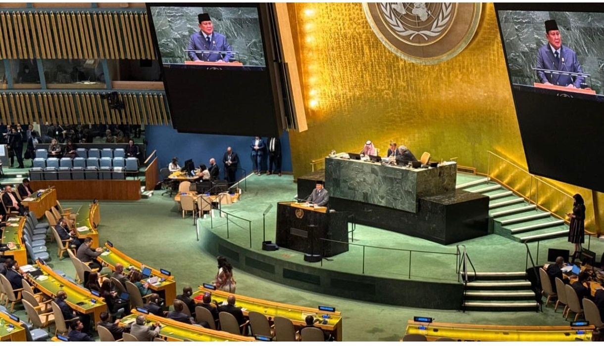 Presiden Republik Indonesia, Prabowo Subianto menyampaikan pidato Konferensi Internasional Tingkat Tinggi untuk Penyelesaian Damai atas Masalah Palestina dan Implementasi Solusi Dua Negara yang digelar di Gedung Majelis Umum Perserikatan Bangsa-Bangsa (PBB), New York, Amerika Serikat. Foto Sekretariat Presiden