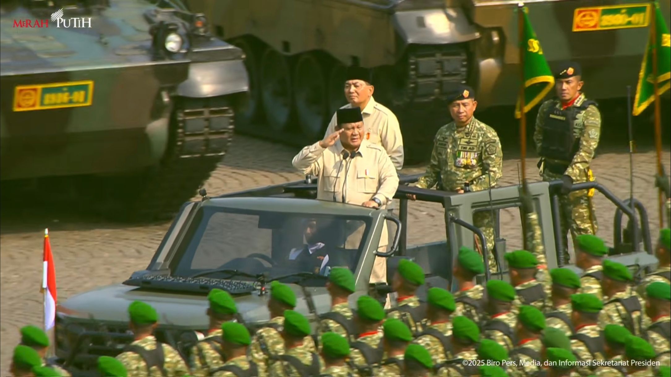 Presiden Prabowo Subianto memimpin upacara peringatan HUT ke-80 TNI yang digelar di Silang Monas, Jakarta, Minggu (5/10/2025). Upacara dimulai saat Presiden Prabowo yang menaiki mobil Maung RI-1 tiba di Lapangan Silang Monas. Di belakang kendaraan Prabowo, tampak mobil yang ditumpangi Menteri Pertahanan (Menhan) Sjafrie Sjamsoeddin dan Panglima TNI Jenderal Agus Subiyanto. Foto Sekretariat Presiden