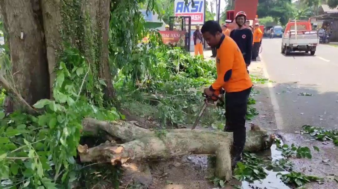 Petugas BPBD-PK Kab. pandeglang lakukan Pemotongan Pohon di Jalan Raya Pandeglang Rangkasbitung (Sumber : TB Agus Jamaludin).