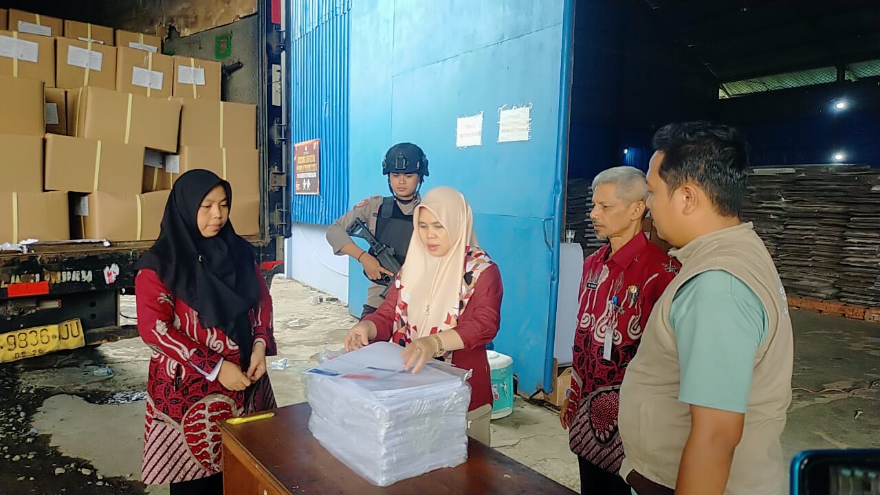 Ketua KPU di gedung logistik sedang memeriksa surat suara. Foto : TB Agus jamaludin