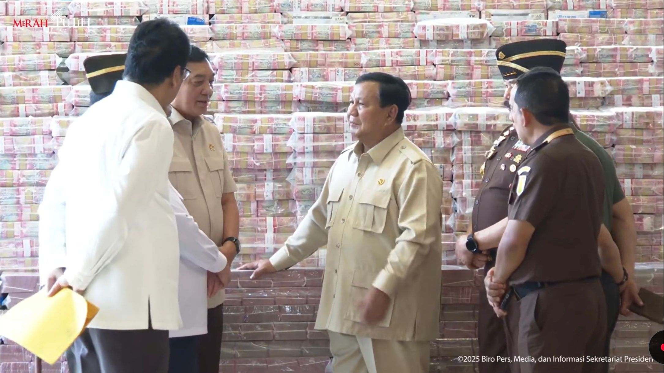Presiden Prabowo Subianto menghadiri agenda penyerahan uang pengganti kerugian negara senilai Rp13,2 triliun dalam perkara tindak pidana korupsi pemberian fasilitas ekspor crude palm oil (CPO) dan turunannya di Gedung Utama Kompleks Kejaksaan Agung, Kebayoran Baru, Jakarta Selatan, Senin (20/10/2025). Foto Sekretariat Presiden