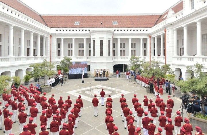 Momen ketika anak-anak Sekolah Rakyat upacara peringatan Sumpah Pemuda, sekaligus belajar langsung tentang sejarah dan nilai uang rupiah di Museum Bank Indonesia. Foto : Istimewa/ Kemensos
