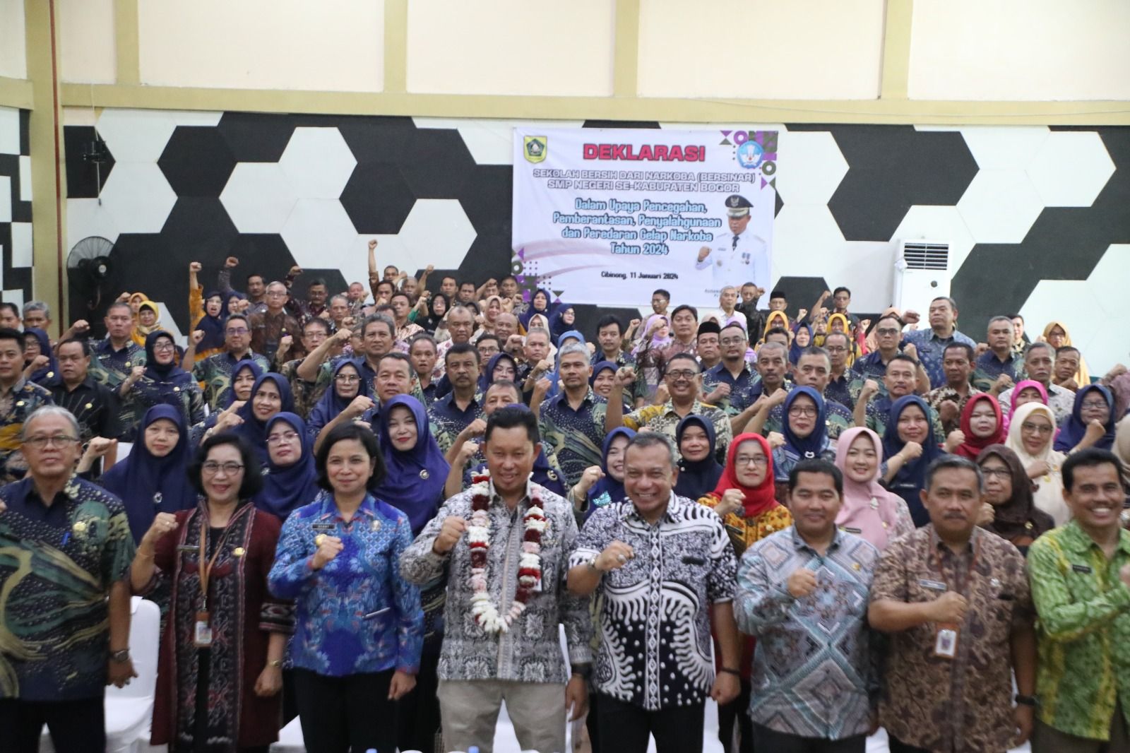 Pj Bupati Bogor Asmawa Tosepu mendeklarasikan program "Sekolah Bersih Narkoba" (Bersinar) bersama Kepala Sekolah SMP se-Kabupaten Bogor, pada Kamis 11 Januari 2024. Foto: Istimewa