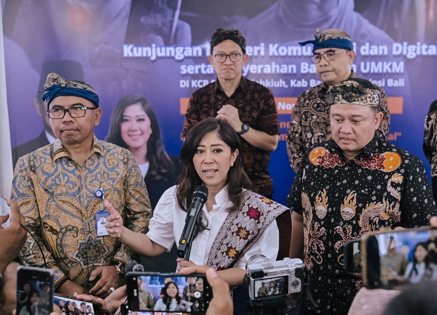 Menteri Komunikasi dan Digital (Menkomdigi) Meutya Hafid (tengah) bersama Plt. Direktur Utama PT Pos Indonesia, Haris (kiri) di Kantor Layanan Pos Universal (LPU) Blahkiuh, Kabupaten Badung, Bali. Foto : Istimewa/ Kemkomdigi