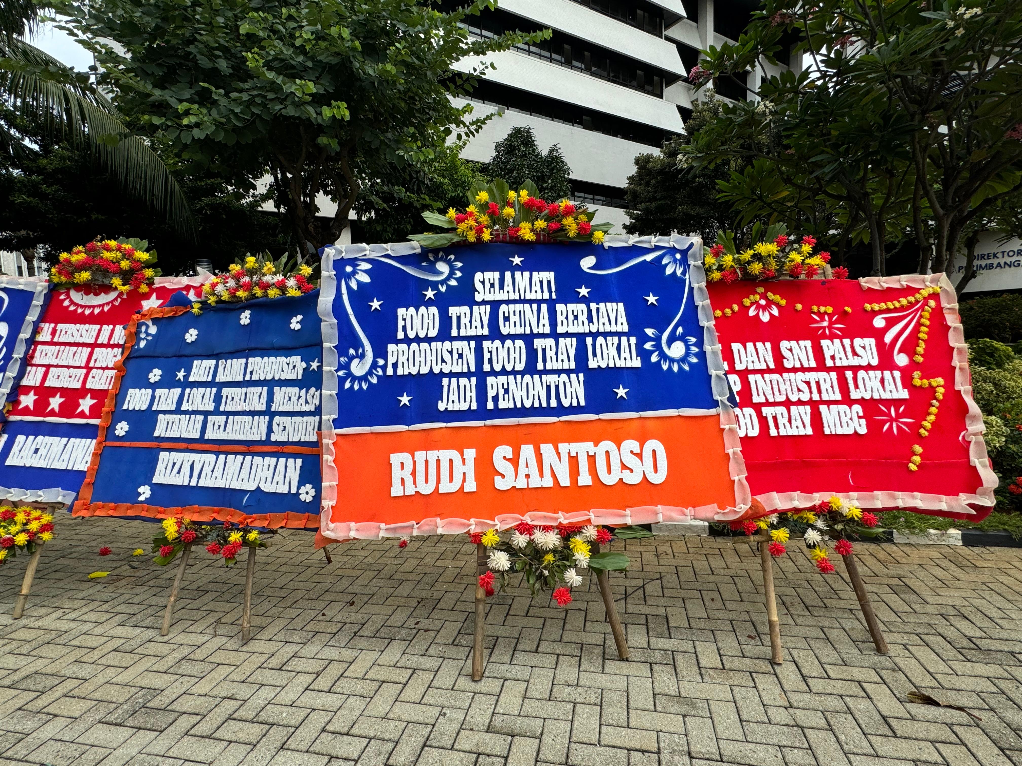 Di halaman Gedung Juanda I Kemenkeu, sejumlah karangan bunga berisi pesan dukungan, kritik, dan permintaan evaluasi terpampang. Salah satu pesan bertuliskan, “Selamat food tray China Berjaya, produsen food tray lokal jadi penonton,” ditandatangani seorang produsen bernama Rudi Santoso.