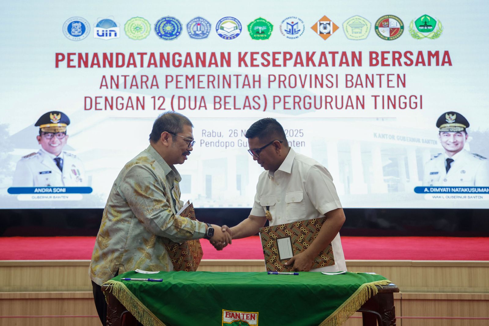 “Dalam konteks inilah, perguruan tinggi memegang peran yang sangat strategis sebagai pusat ilmu pengetahuan, penelitian dan inovasi,” kata Andra Soni usai Penandatanganan Kesepakatan Bersama antara Pemerintah Provinsi Banten dengan 12 perguruan tinggi di Pendopo Gubernur Banten, KP3B, Kota Serang, Jumat 28 November 2025.