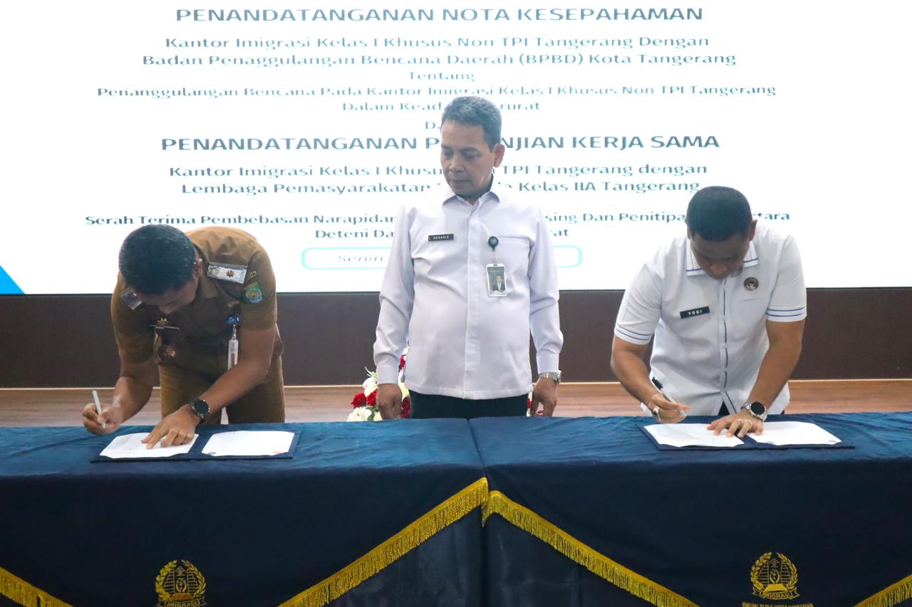 Tangerang, tvrijakartanews - Kantor Imigrasi Kelas I Khusus Non TPI Tangerang menjalin kerja dama strategis dengan BPBD Kota Tangerang dan Lapas Pemuda Kelas IIA Tangerang, untuk penanganan keadaan darurat lintas sektor. Kerja sama ini secara spesifik berfokus pada peningkatan kesiapsiagaan dan penanganan keadaan darurat.