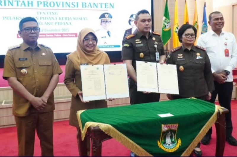 Pandeglang,tvrijakartanews— Pemerintah Kabupaten Pandeglang, Banten menyatakan dukungannya terhadap penerapan hukuman kerja sosial sebagai alternatif pemidanaan bagi pelanggar hukum ringan. Dukungan tersebut disampaikan Bupati Pandeglang, Dewi Setiani saat menghadiri kegiatan Penandatanganan nota kesepahaman ( MoU) bersama Kejaksaan Tinggi Banten di Pendopo Gubernur Banten, yang di hadiri langsung oleh Gubernur Banten, Andra Soni.