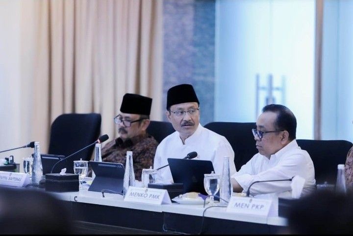 Momen rapat koordinasi lintas kementerian/lembaga dalam membahas strategi penanganan bencana di wilayah Sumatera. Menteri Sosial (Mensos) Saifullah Yusuf (tengah) dan Menteri Koordinator Bidang Pembangunan Manusia dan Kebudayaan (Menko PMK) Pratikno (kanan). Foto : Istimewa/ Kemensos