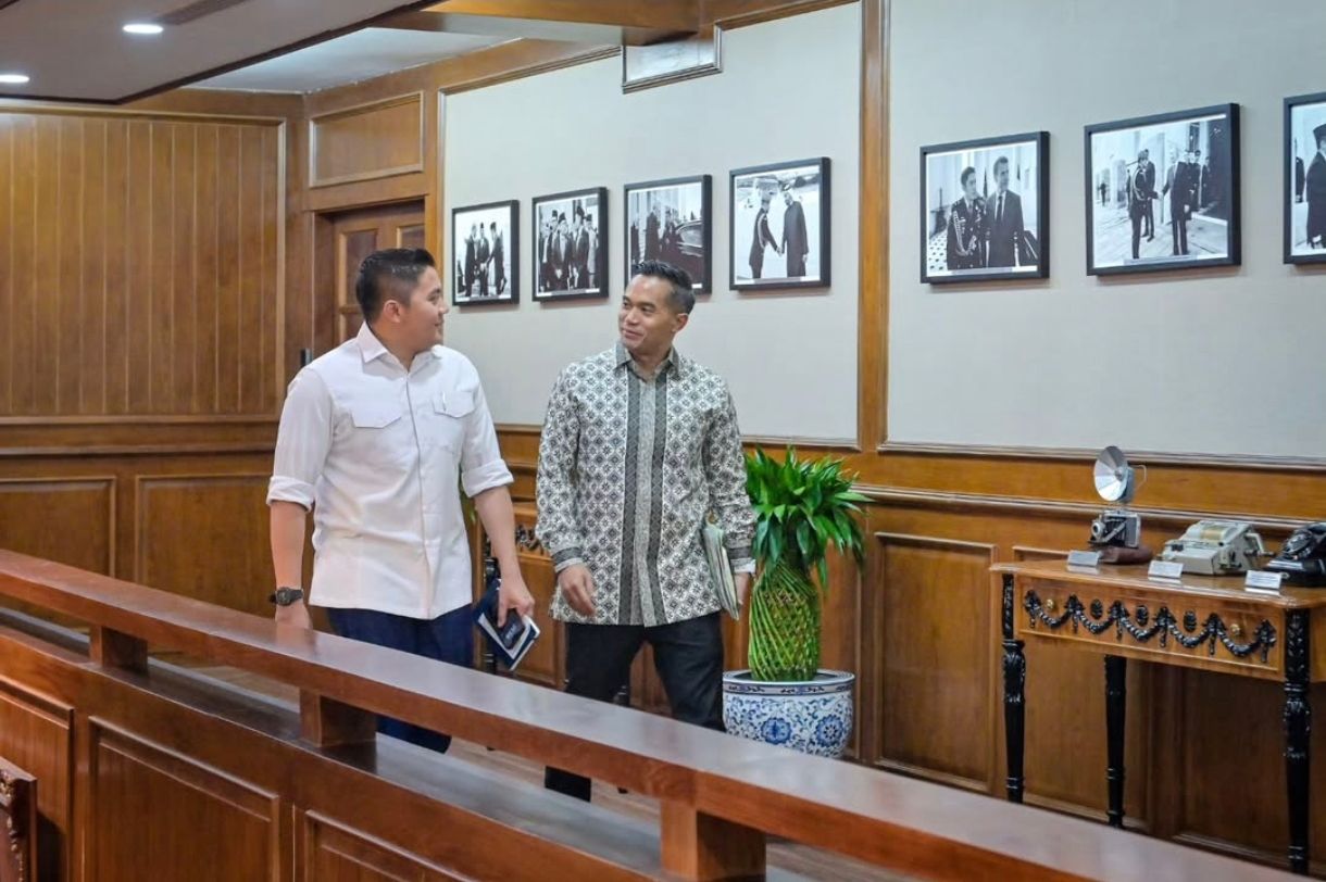 Sekretariat Kabinet Teddy Indra Wijaya menerima Ketua Kamar Dagang dan Industri Indonesia (KADIN) Anindya Bakrie di Kantor Sekretariat Kabinet, Jakarta, Kamis (15/1/2026) malam. Pertemuan ini membahas penguatan sinergi pemerintah dan dunia usaha, sekaligus persiapan dukungan KADIN Indonesia terhadap agenda strategis nasional, termasuk rencana kunjungan kenegaraan Presiden ke Eropa. Foto Sekretariat Presiden