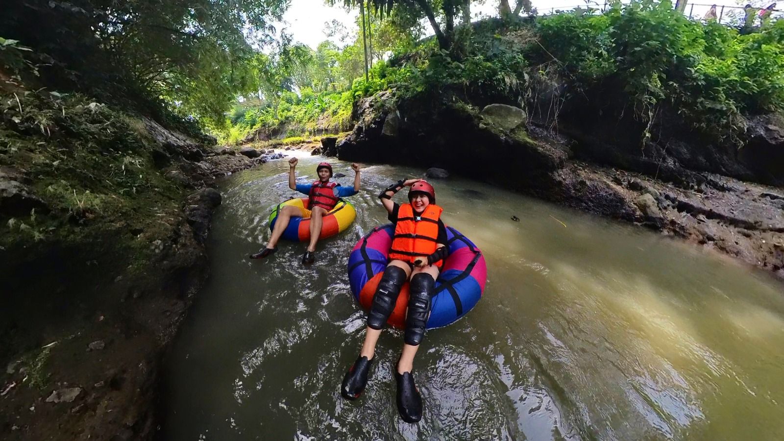 Keseruan bermain tubing di arus sungai sepanjang 300 meter ini semakin lengkap dengan pemandangan area hijau di sekitarnya.