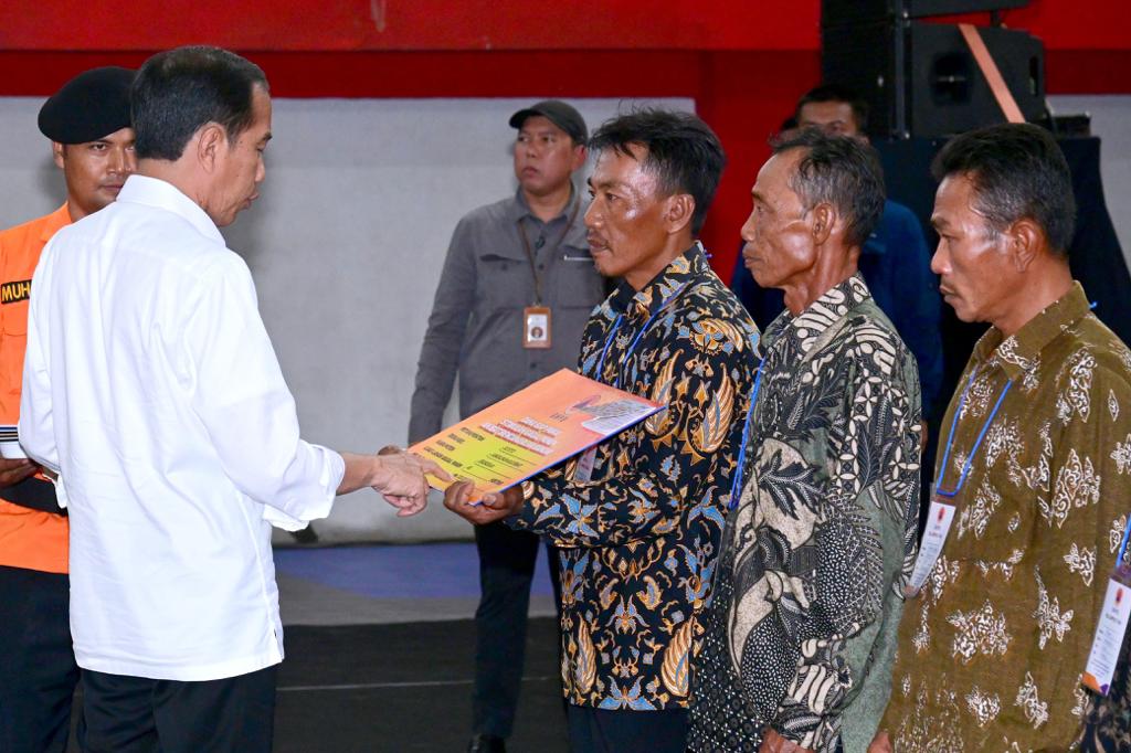 Presiden RI Joko Widodo menyerahkan bantuan stimulan kepada petani gagal panen (puso) akibat bencana alam banjir di Gor Bung Karno, Kota Purwodadi, Kabupaten Grobogan, Jawa Tengah, Selasa (23/1)/ Dok.BNPB