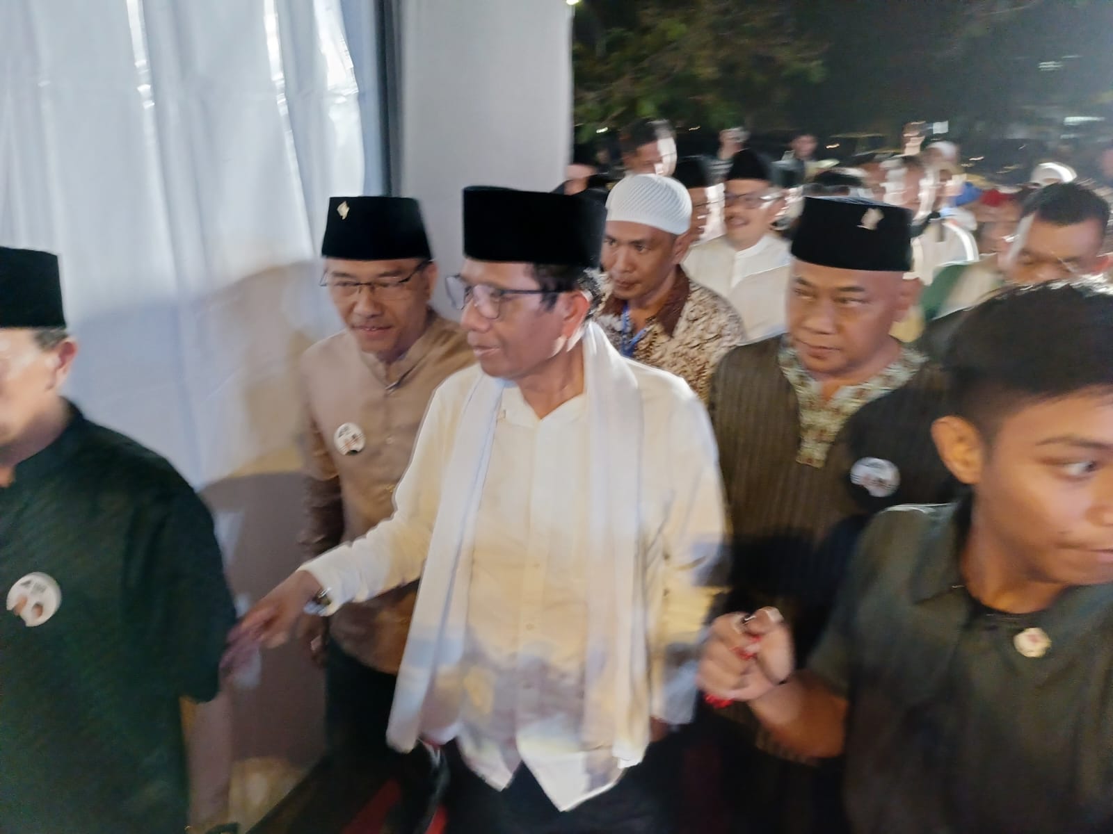 Dengan mengenakan baju koko putih dan peci hitam, Mahfud MD tiba sekitar pukul 21.30 WIB. Kedatangan Mahfud MD juga disambut hangat oleh para jemaah dan tamu undangan lainnya.