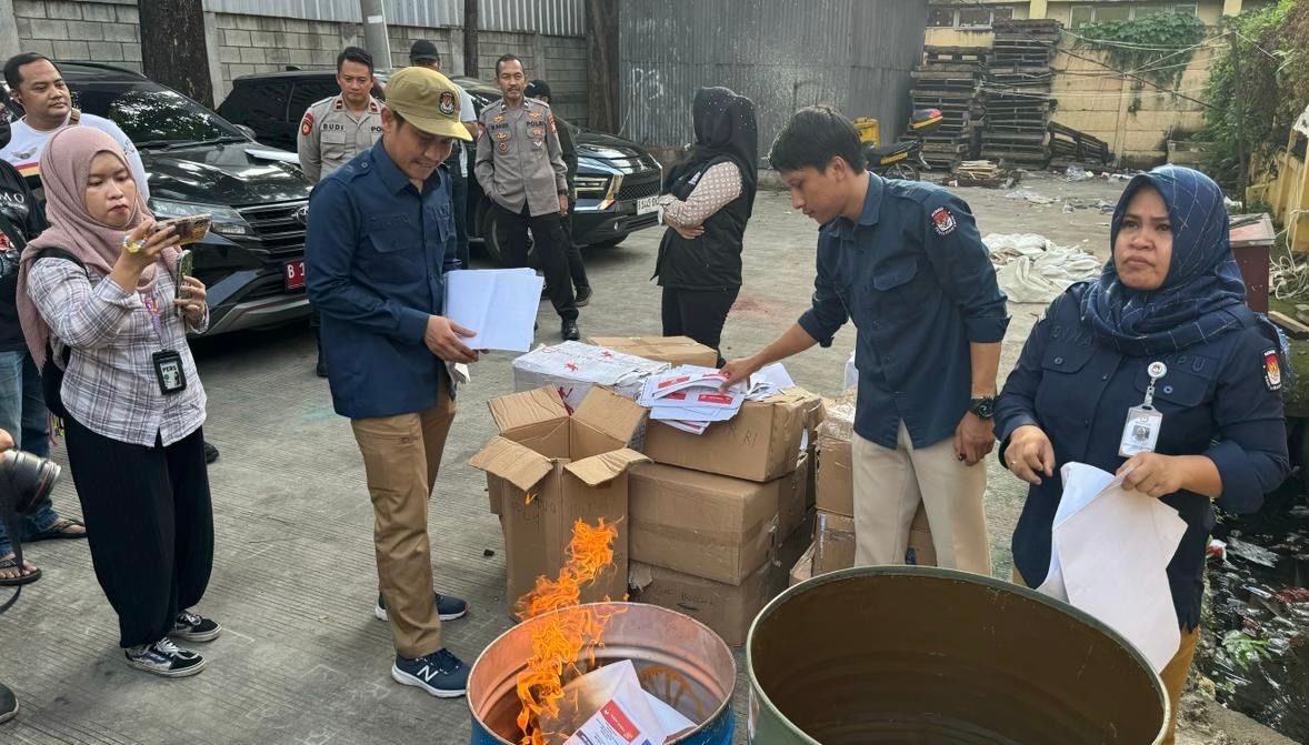 KPU Bersama Bawaslu Kota Tangsel Musnahkan 16.371 Lima Jenis Surat Suara Pemilu 2024 di Gudan Logistik Yang Berlokasi di Pergudangan Multiguna Paku Alam, Serpong Utara.